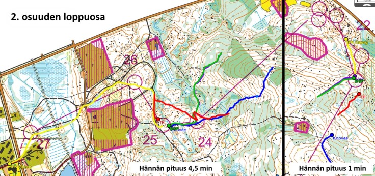 Jo ensimmäinen maastokäynti aiheutti ensimmäiset muutokset ja radat alkoivat hioutumaan lopulliseen muotoonsa. Ensimmäiset koejuoksut myös antoivat mahdollisuuden hieman pidentää silloisia suunnitelmia, koska pelko oli, että radat ovat liian pitkät ja hitaat. Jukolan hajontamalleille ei meillä ollut vaihtoehtoisia ajatuksia. Oltiin samoilla linjoilla Simon kanssa.
